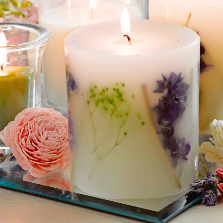 THIS HAND-POURED, PILLAR CLAIRE BURKE CANDLE UNIQUELY DISPLAYS A VARIETY OF HAND-ARRANGED BOTANICALS INCLUDING LARKSPUR, GREEN SESAME BLOOM AND LACY BUDS. THIS ILLIMINATING CNADLE MAKES A LOVELY HOUSEWARMING GIFT FOR THE CANDLE OR PLANT ENTHUSIAST. ENJOY THE APPEAL OF THE ORIGINAL FRAGRANCE WITH A TIMELESS BLENDED FRAGRANCE OF ROSE, LAVENDER, PATCHOULI, VETIVER, AND SPICES.