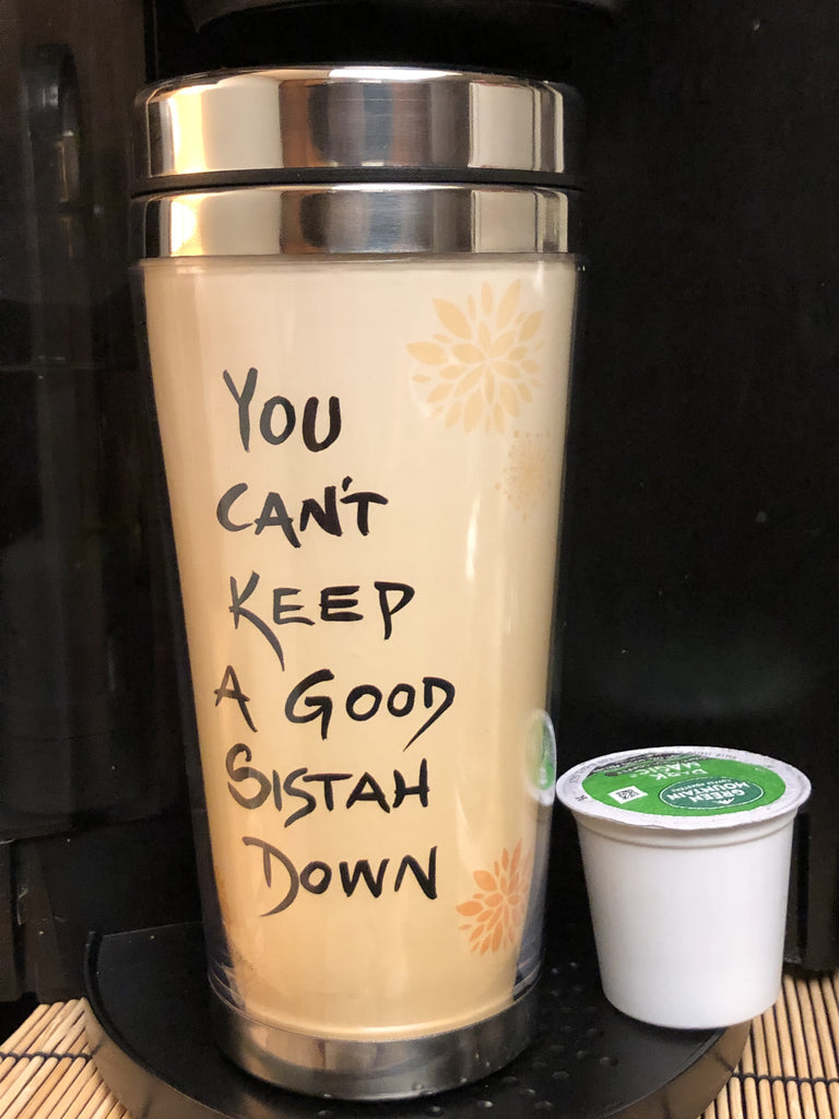 YOU CAN'T KEEP A GOOD SISTAH DOWN 16 oz. Travel Mug (Artwork by Cidne Wallace) Tell the world that you are a survivor and a strong phenomenal woman while sipping from your YOU CAN'T KEEP A GOOD SISTAH DOWN Travel Mug! Our travel mugs are trendy, artistic, durable, and most of all, affordable! Whether you're traveling by car, train, plane, or bus, our mugs are the ultimate in convenience. They are perfect for toting your drinks on the go and fits in most car consoles. No matter what you're drinking, our travel mugs will keep your beverage cool or hot and enjoyable to the very last drop! Works well with coffee, tea, water, juices, and smoothies. Our mugs are 16 oz. with double wall stainless steel and a skid-resistant bottom. Each mug comes individually boxed for gift giving. They are lightweight and feature beautiful artwork by Cidne Wallace.